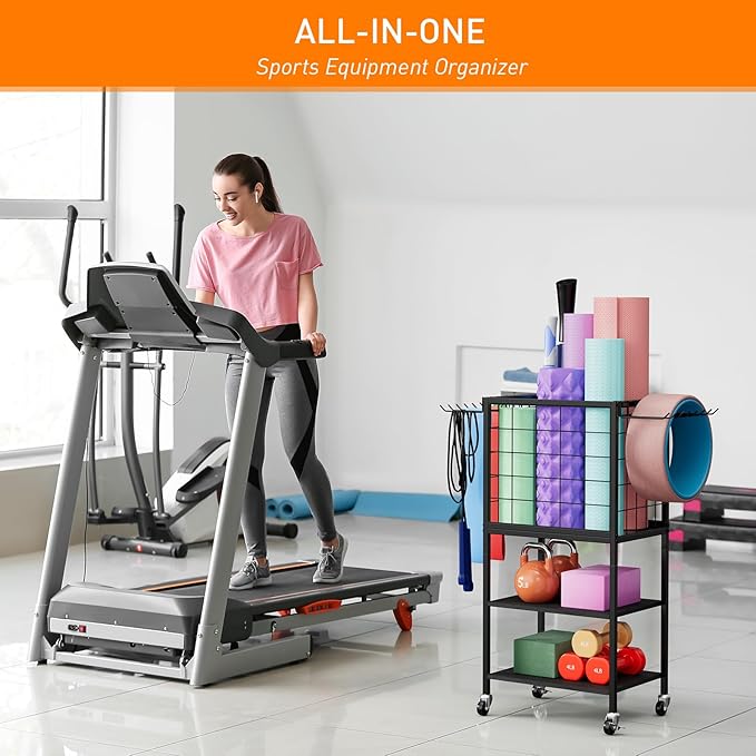 - Flexible Mobile Design: This small metal wood home gym workout equipment storage is equipped with four solid multi-directional wheels and two brake equipped wheels, making movement easy and effortless. At the same time, 4 adjustable foot pads ensure the stability of the shelf on any floor, meeting your different needs.