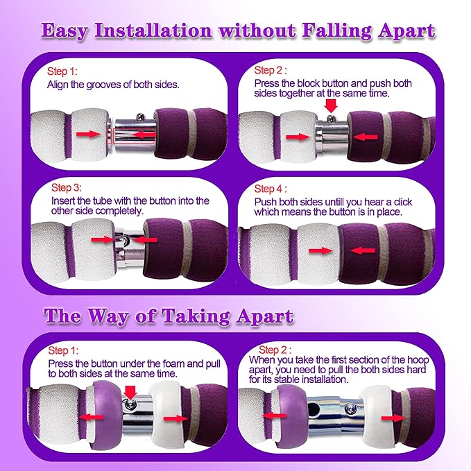 - 【8 Detachable Sections for Carrying and Keeping easily】The hoop can be taken apart into 8 sections. Every section is 16in long, so the hoop is easy to carry and store away. When the 8 sections are connected, the whole hoop is 37in in diameter, which is a plus size and big enough for sufficient exercise.