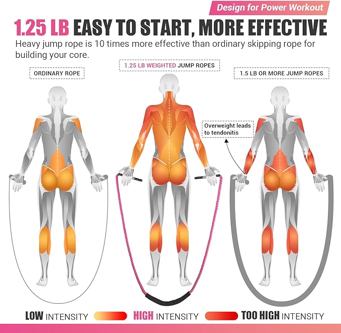 - [WEIGHTED JUMP ROPE DESIGNED FOR WOMEN] Weighted Jump Rope is a great way to get fit, 1.25 lbs Weighted Jump Rope for Beginners is an entry level Weighted Jump Rope for Women, Not too heavy to cause tendonitis. Helps work the entire body and ignites calorie burning with each energizing jump, building endurance and promoting weight loss.