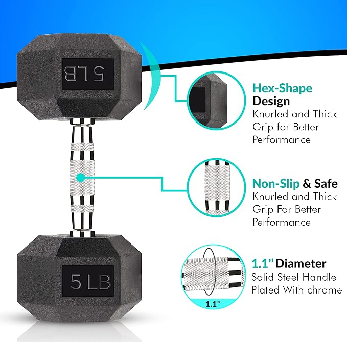 - Single 5 lbs high quality extreme durable rubber coated dumbbell, Premium grade cast iron heads, coated with heavy-duty rubber compound.