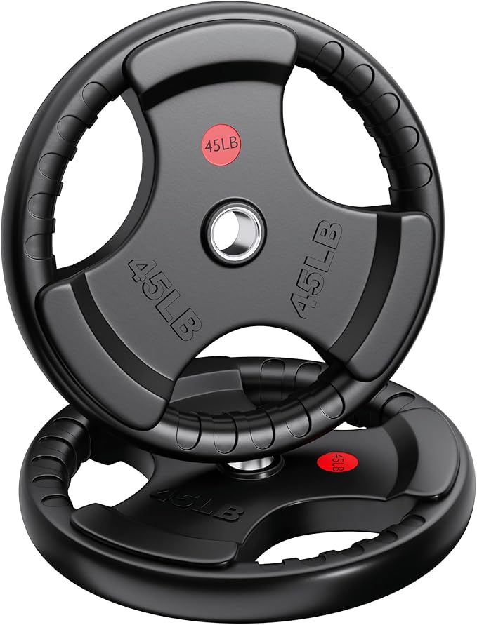 - EASY GRIP – The Olympic weight plates is designed with three holes and there are grooves in the grip holes for easy and safe handling when loading and unloading heavy objects. Descending and lowering after weight training is safer and more practical. The comfortable grip also gives you a good using experience.