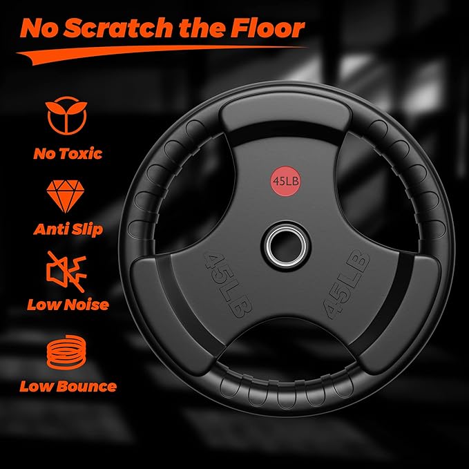 - EASY GRIP – The Olympic weight plates is designed with three holes and there are grooves in the grip holes for easy and safe handling when loading and unloading heavy objects. Descending and lowering after weight training is safer and more practical. The comfortable grip also gives you a good using experience.