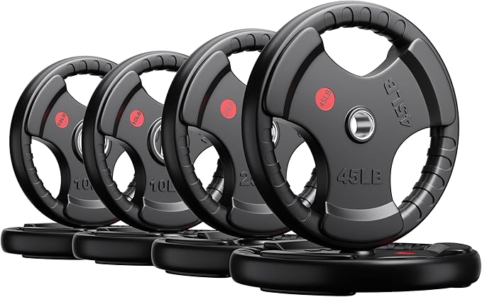 - EASY GRIP – The Olympic weight plates is designed with three holes and there are grooves in the grip holes for easy and safe handling when loading and unloading heavy objects. Descending and lowering after weight training is safer and more practical. The comfortable grip also gives you a good using experience.
