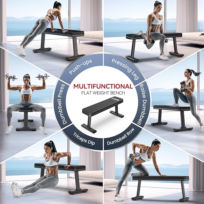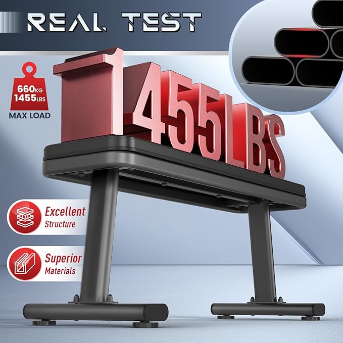 - 【Max Load 1455LBS/660KG】With a maximum load-bearing capacity of 1455LB/660KG, our fitness bench is engineered to withstand intense workouts and heavyweights. Crafted with thick steel material, the workout bench is built to last. The flat bench ensures stability even during the most challenging exercises.
