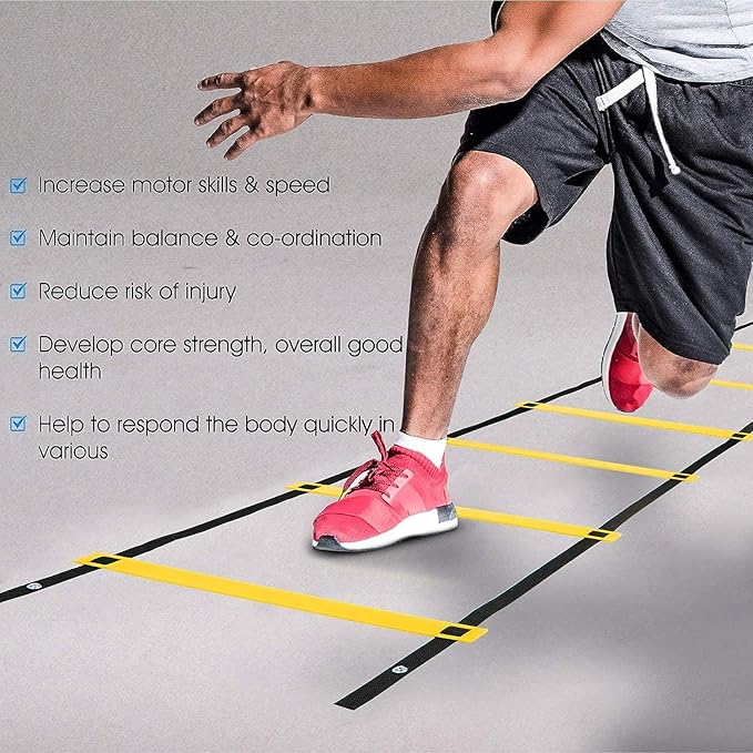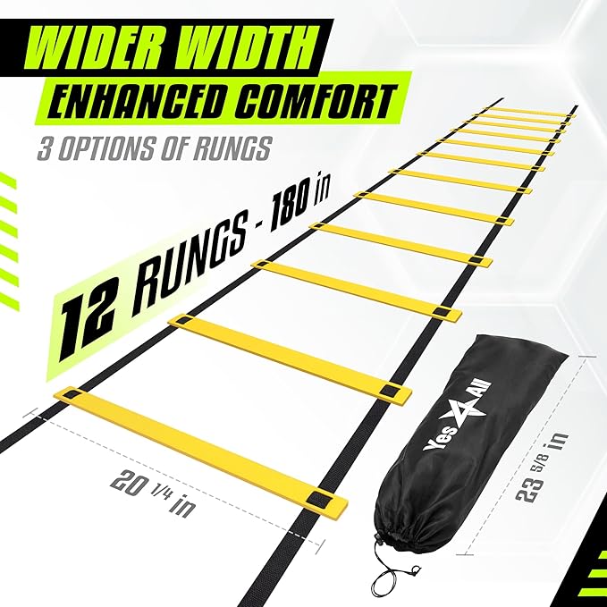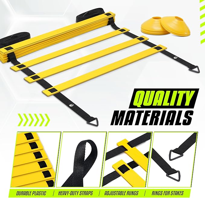 - THE PERFECT SIZE WITH 12 DURABLE PLASTIC RUNGS DESIGN: The agility ladder comes with 12 durable plastic rungs with nylon straps for different levels, skill sets and exercises. Suitable to meet all your workout demands.