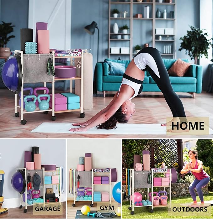 • 【HIGH QUALITY YOGA MAT STORAGE RACK】 This yoga mat holder is made of high-quality coated finish steel and wood storage rack, combined with a cloth storage basket, the whole construction is sturdy and durable, it will match well with any of your furniture. The yoga mat storage suitable for various scenarios, such as gym, home gym, living room, bedroom, garage and so on.