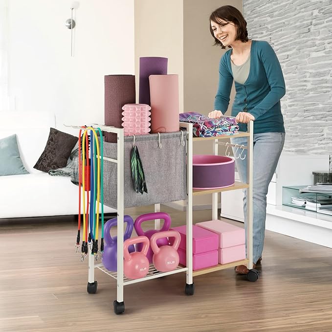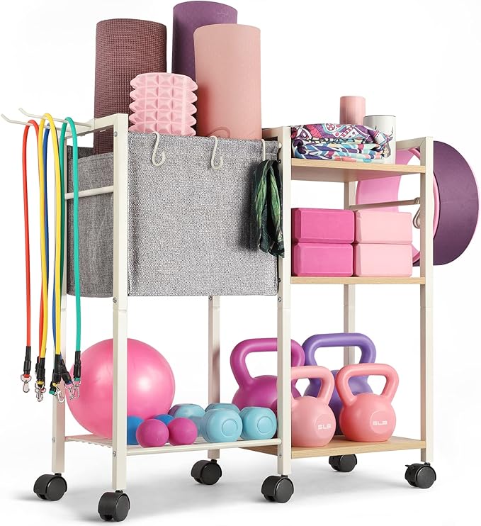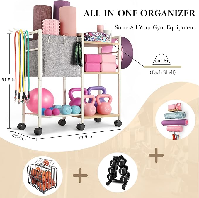 • 【EXTRA LARGE CAPACITY HOME GYM STORAGE RACK】 Our exercise equipment storage rack consists of 4-tier of storage racks and a storage basket, which can store your various fitness equipment, such as workout mat, yoga mat thick, yoga block, foam roller, dumbbells, kettlebells, resistance bands and so on, perfect for fan of yoga and fitness enthusiast.