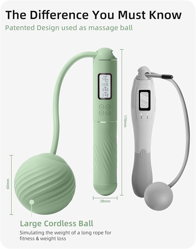 - 2.Patented 2In 1 Design for Stability: Our innovative design includes a large cordless ball that ensures the rope won't easily fall. The external thread of the ball doubles as a massage ball, simulating the weight of a long rope for fitness and weight loss. Additionally, two removable counterweights enhance fat burning and accelerate sweating.