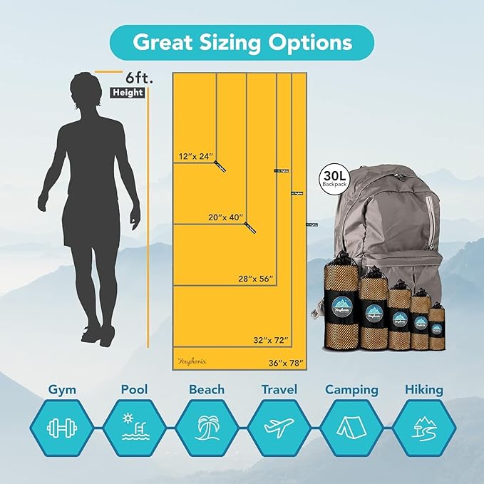 • PACK FOR ANY SITUATION: Youphoria all-purpose travel towels come in three convenient sizes, in inches: 20 x 40, 28 x 56, and 32 x 72. Whether you need pack light camping towel, shower gym towel, a small pack towel, or a large beach towel, we've got your covered. Youphoria microfiber towels are a more convenient and packable option for your on-the-go needs.