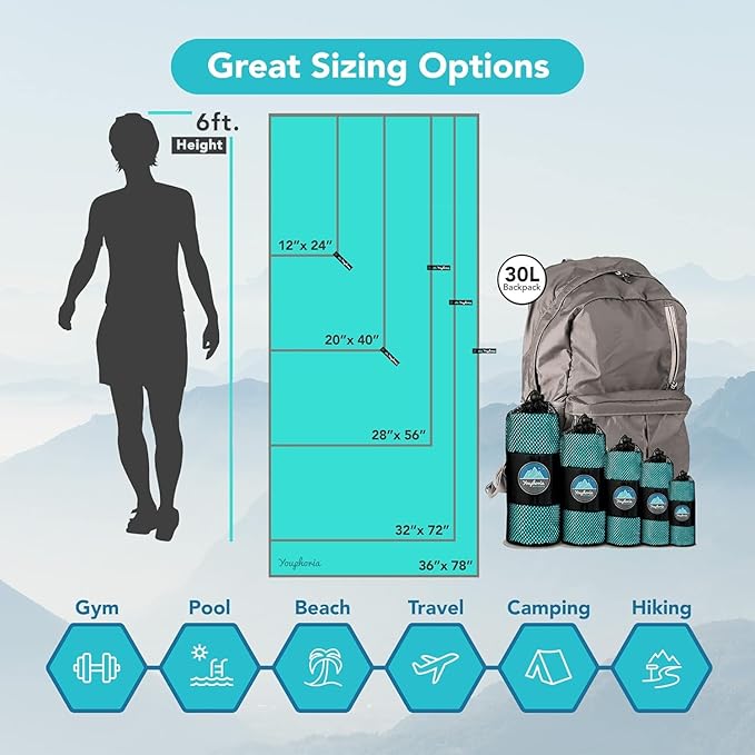 - PACK FOR ANY SITUATION: Youphoria all-purpose travel towels come in three convenient sizes, in inches: 20 x 40, 28 x 56, and 32 x 72. Whether you need pack light camping towel, shower gym towel, a small pack towel, or a large beach towel, we've got your covered. Youphoria microfiber towels are a more convenient and packable option for your on-the-go needs.