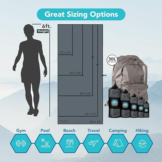 • PACK FOR ANY SITUATION: Youphoria all-purpose travel towels come in three convenient sizes, in inches: 20 x 40, 28 x 56, and 32 x 72. Whether you need pack light camping towel, shower gym towel, a small pack towel, or a large beach towel, we've got your covered. Youphoria microfiber towels are a more convenient and packable option for your on-the-go needs.