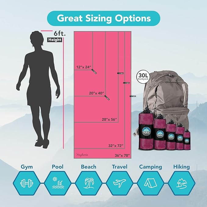 - PACK FOR ANY SITUATION: Youphoria all-purpose travel towels come in three convenient sizes, in inches: 20 x 40, 28 x 56, and 32 x 72. Whether you need pack light camping towel, shower gym towel, a small pack towel, or a large beach towel, we've got your covered. Youphoria microfiber towels are a more convenient and packable option for your on-the-go needs.