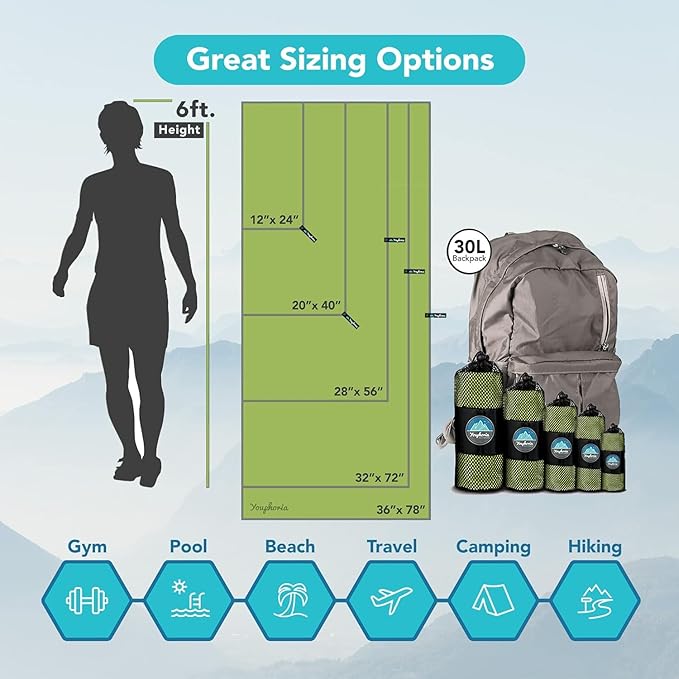 - PACK FOR ANY SITUATION: Youphoria all-purpose travel towels come in three convenient sizes, in inches: 20 x 40, 28 x 56, and 32 x 72. Whether you need pack light camping towel, shower gym towel, a small pack towel, or a large beach towel, we've got your covered. Youphoria microfiber towels are a more convenient and packable option for your on-the-go needs.
