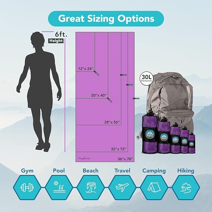 • PACK FOR ANY SITUATION: Youphoria all-purpose travel towels come in three convenient sizes, in inches: 20 x 40, 28 x 56, and 32 x 72. Whether you need pack light camping towel, shower gym towel, a small pack towel, or a large beach towel, we've got your covered. Youphoria microfiber towels are a more convenient and packable option for your on-the-go needs.