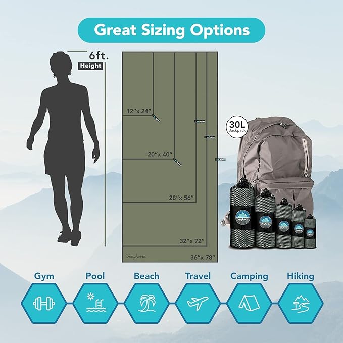 • PACK FOR ANY SITUATION: Youphoria all-purpose travel towels come in three convenient sizes, in inches: 20 x 40, 28 x 56, and 32 x 72. Whether you need pack light camping towel, shower gym towel, a small pack towel, or a large beach towel, we've got your covered. Youphoria microfiber towels are a more convenient and packable option for your on-the-go needs.