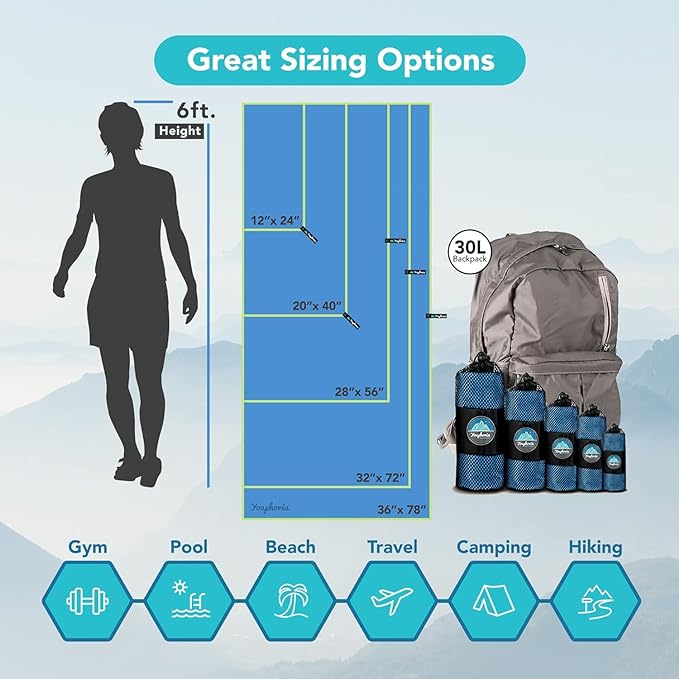 - PACK FOR ANY SITUATION: Youphoria all-purpose travel towels come in three convenient sizes, in inches: 20 x 40, 28 x 56, and 32 x 72. Whether you need pack light camping towel, shower gym towel, a small pack towel, or a large beach towel, we've got your covered. Youphoria microfiber towels are a more convenient and packable option for your on-the-go needs.