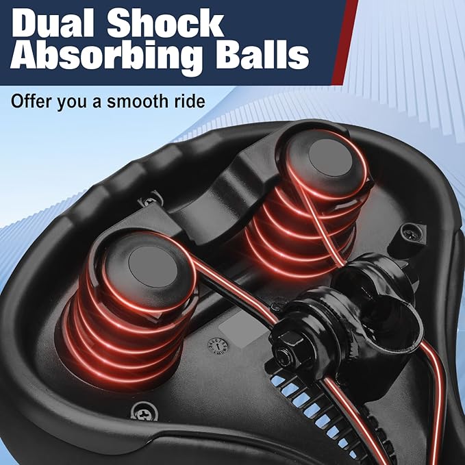 - Shock absorption: The two shock absorbing balls placed beneath the bicycle seat ensure absorbing the shocks coming from the bumps, potholes or any difficult terrain you are riding on. The bike seat features high-density memory foam padding to fit your hips perfectly. Soft and comfortable, relievie pressure on your back and buttocks. Enjoying a healthy and happy cycling trip